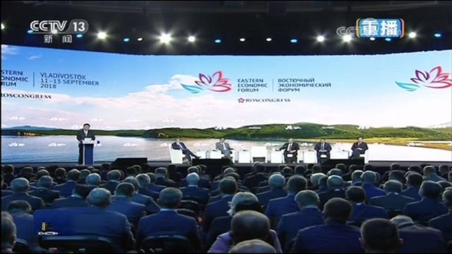 图示:9月12日,在第四届东方经济论坛全会上,国家最高领导人发表题为《共享远东发展新机遇开创东北亚美好新未来》的致辞