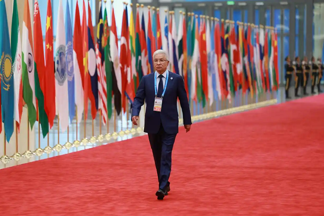 图示:这是集安条约组织秘书长塔斯马加姆别托夫步入梅江会展中心。